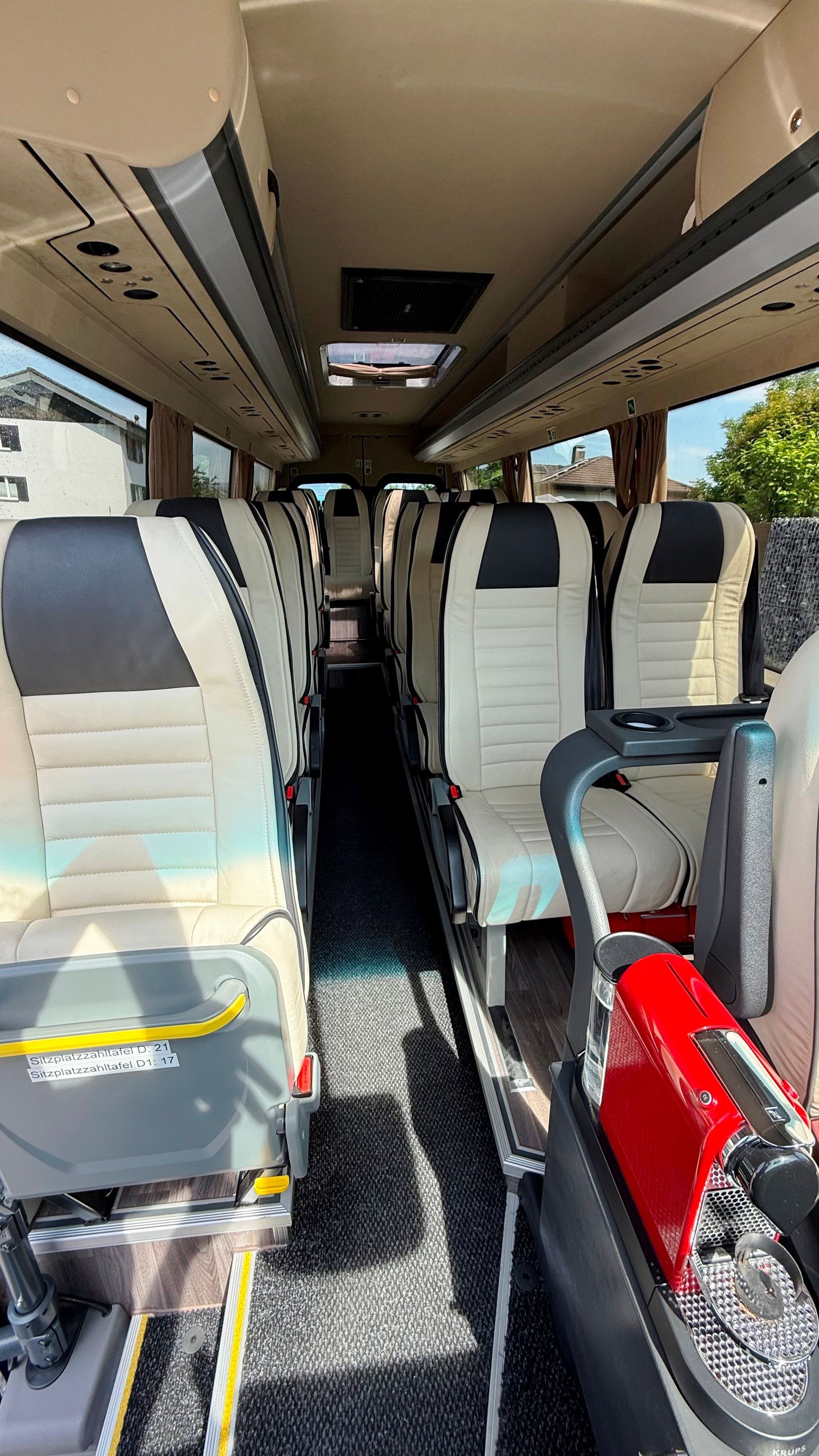 Ausstattung: Top-moderner Luxus-Reisecar mit Klimaanlage, WC, Bordküche, Nespresso Kaffeemaschine, Kühlschrank, Frontkamera, DVD-Anlage, iPod-Anschluss, ****Luxline-Bestuhlung, Panoramadach, Jasstische, Klapptischchen, Fussstützen, Parkettboden in Schiffsbodenoptik, 230 V Steckdose, WLAN usw.