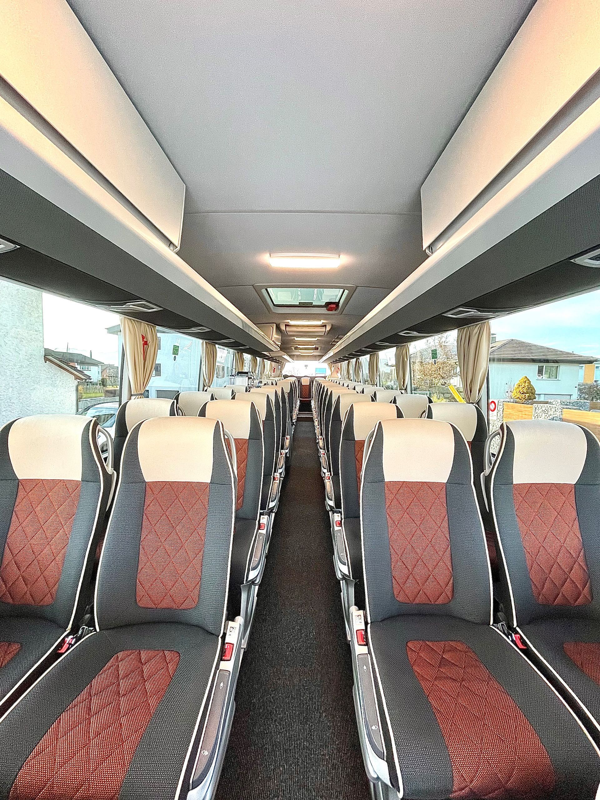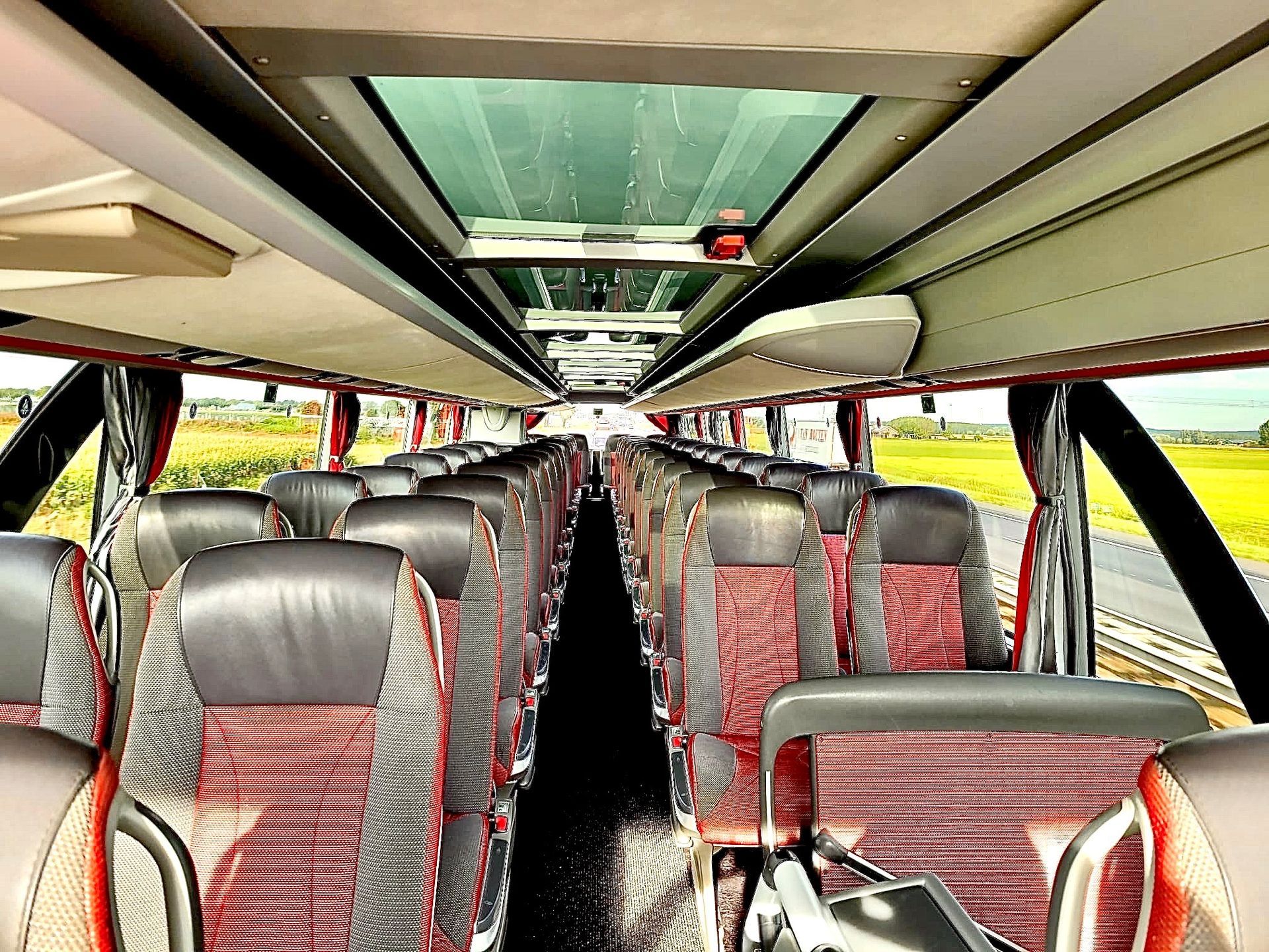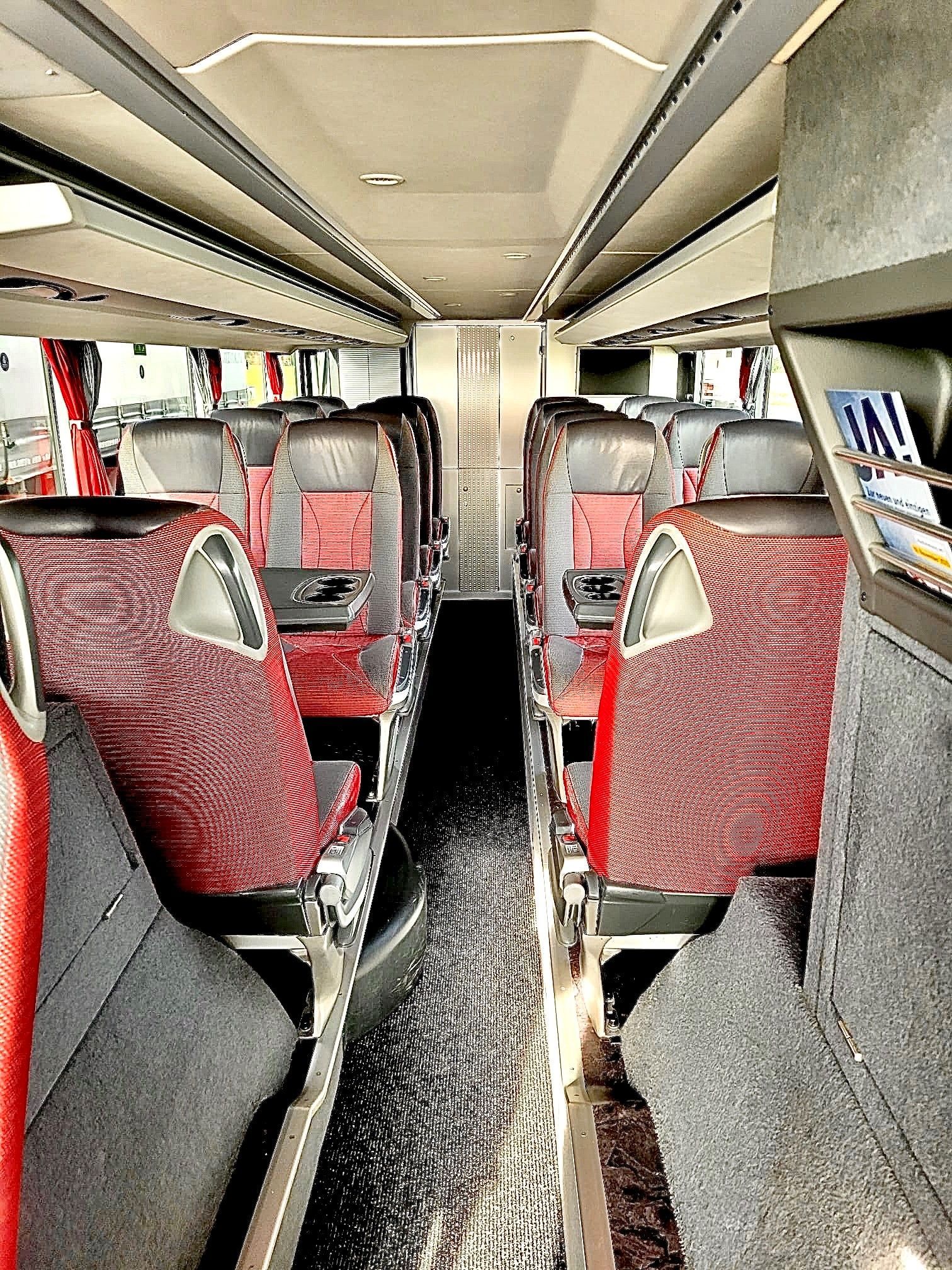 Ausstattung: Top-moderner Luxus-Reisecar mit Klimaanlage, WC, Bordküche, Nespresso Kaffeemaschine, Kühlschrank, Frontkamera, DVD-Anlage, iPod-Anschluss, ****Luxline-Bestuhlung, Klapptischchen, Fussstützen, Parkettboden in Schiffsbodenoptik, 230 V Steckdose, WLAN usw.
