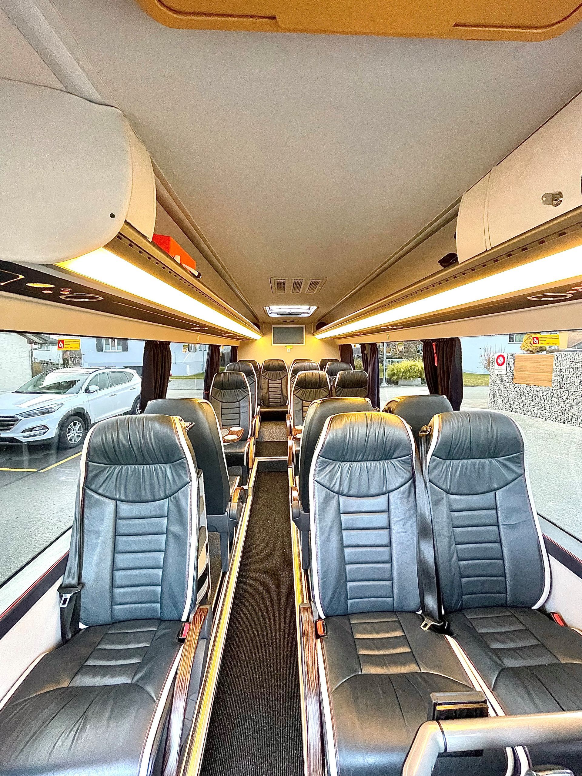 Ausstattung: Top-moderner Luxus-Reisecar mit Klimaanlage, WC, Bordküche, Nespresso Kaffeemaschine, Kühlschrank, DVD-Anlage, iPod-Anschluss, ****Luxline-Bestuhlung, Jasstisch, Klapptischchen, Fussstützen, Parkettboden in Schiffsbodenoptik, 230 V Steckdose, WLAN usw.